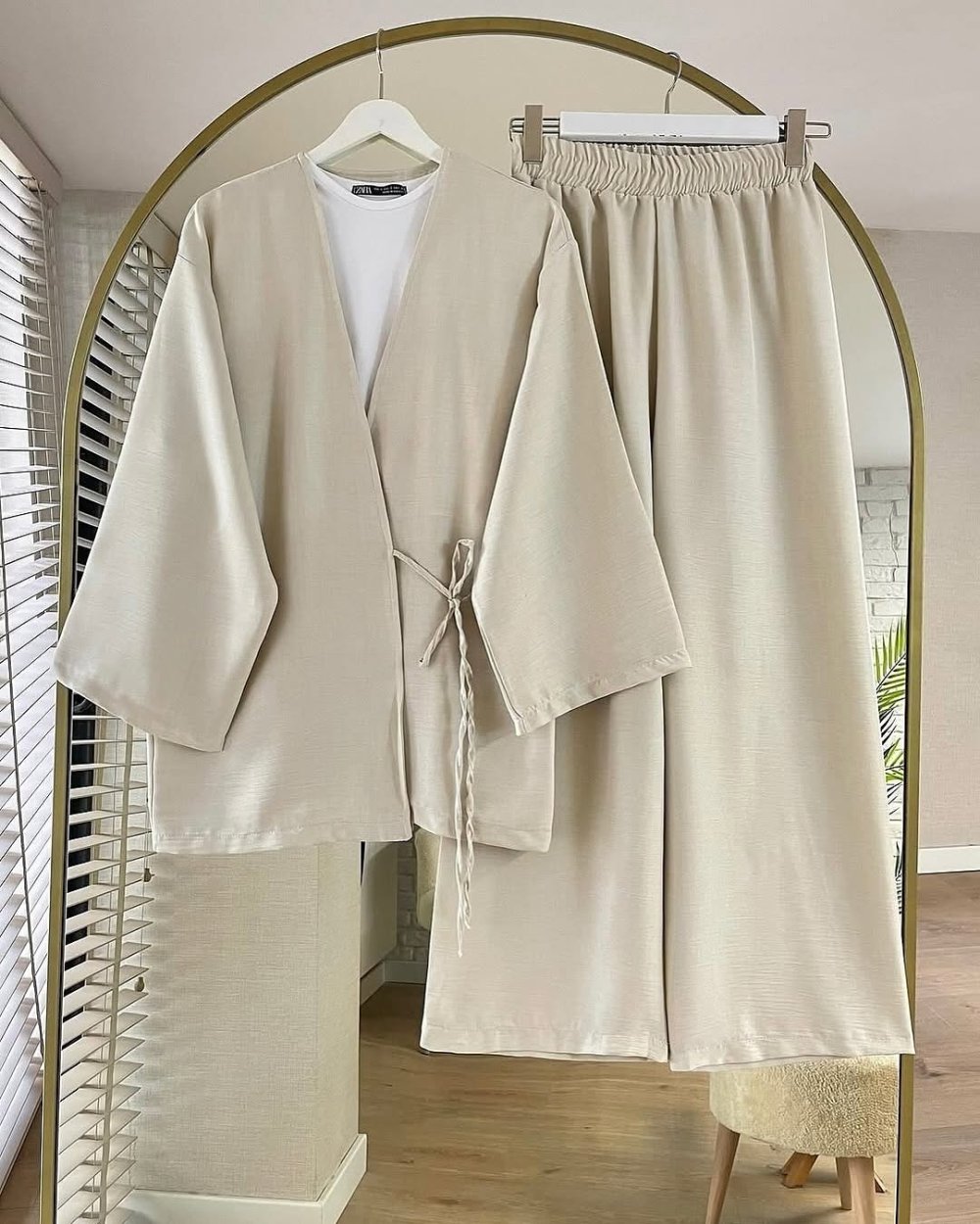 Yan Bağlamalı Kimono Takım Taş Rengi