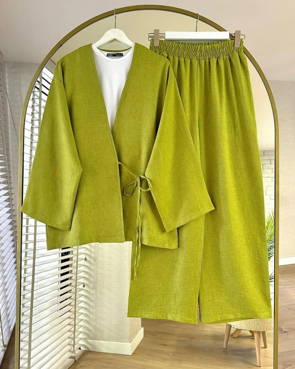 Yan Bağlamalı Kimono Takım Yağ Yeşili